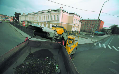 Вдоволь насмотревшись на работу «Бухера», мы направляемся на улицу Польских повстанцев, где в паре с «КамАЗом» работает «Скандия». По дороге можно видеть, что техника есть и на других участках – на отрезке дороги по улице Канадзавы или Пятой армии. Как только мы прибываем на место, подъезжает и самосвал в сцепке с подметально-уборочной машиной. Затем он показательно проезжает по обеим сторонам улицы.