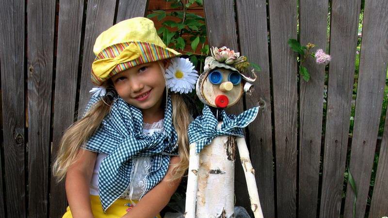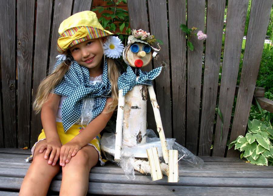 Нашёл дедушка в лесу длинный ствол берёзы, еле до дому его донёс. Приготовил инструменты – ножовку, топор, гвозди, плоскогубцы – и принялся за работу. Лизонька стояла и подсказывала, из чего лучше сделать кукле рот и глаза. Она принесла целую кучу пластмассовых крышек от напитков (пригодились запасы, собранные за целый год), они были все разные, хватило и на рот кукле, и на глаза. Волосы сделали из коры берёзы, получились кудри блондинки, на голову прикрепили пластмассовый цветок лилии – шляпка. Туловище соорудили из толстой части полена, а ноги и руки – из тонкой макушки. Но нам нужно было сделать девочку, а значит, надо юбку, чтобы сразу было видно, кто это. Тогда дедушка выпилил из полена ещё одну часть туловища. Между основным туловищем и его деталью мы с Лизонькой поместили большую крышку от ведра из-под водоэмульсионной краски, а вместе с ней ещё большой кусок полиэтилена, разрезав его по краям, чтобы он развевался от ветра. Получилась юбочка, как у балерины. Внучка и мы так увлеклись работой, что ничего не замечали вокруг…