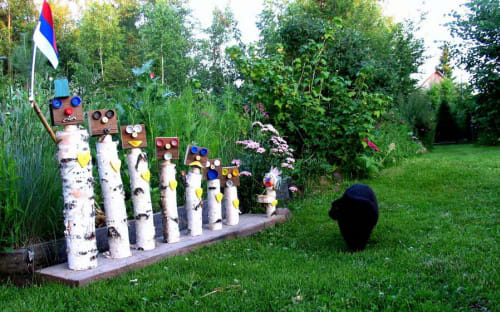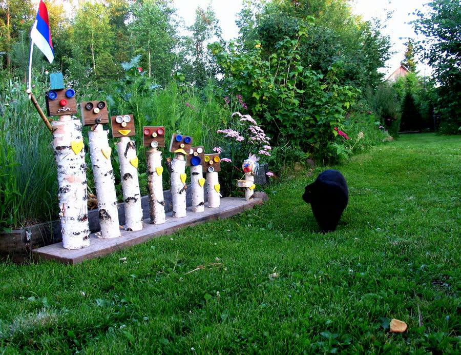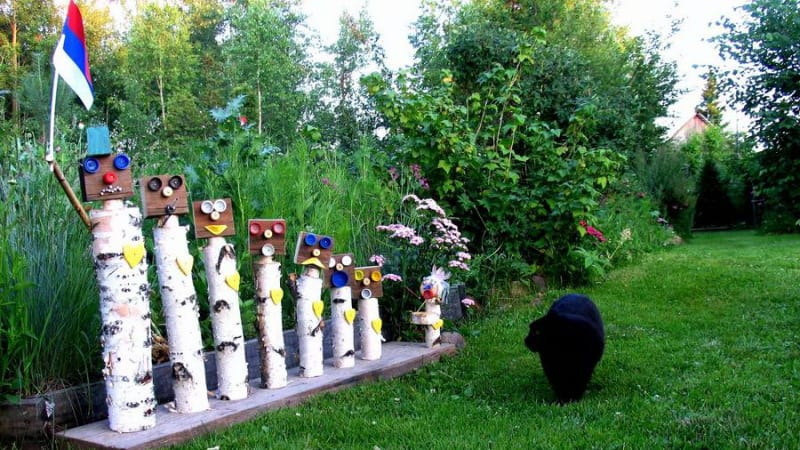 А мы, немного передохнув, неожиданно для себя решили из оставшегося берёзового ствола сделать ещё одну куклу, а потом… ещё: получилось целое войско солдатиков, разных по высоте, но у каждого своё особенное лицо; только одно их объединяет – слева жёлтое сердечко, и у всех доброе. Так в нашем саду появились «малые архитектурные формы». Слух о них быстро разлетелся по садоводству, приходят и дети, и взрослые – всем интересно и весело смотреть на наш хоровод кукол.