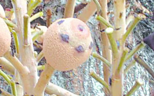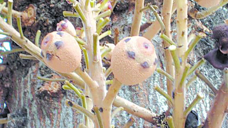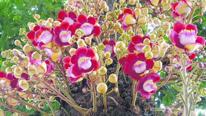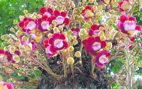 На одной из улиц в центре Рио-де-Жанейро (переводится как «Январская река») перед самым Рождеством увидела удивительное дерево, размером с наш тополь: на высоте около двух метров ствол был опоясан букетами пре-краснейших цветов, росших прямо из него. Казалось, что дерево именно к Рождеству покрылось красно-белыми цветами. Через две недели снова оказалась на той же улице – цветы отцвели, и на их месте образовались несъедобные плоды-шарики. Никто не мог мне сказать, как называется дерево, дома пересмотрела все имеющиеся справочники и энциклопедии, но так и не нашла названия.