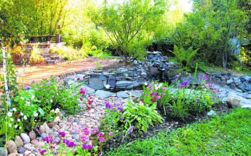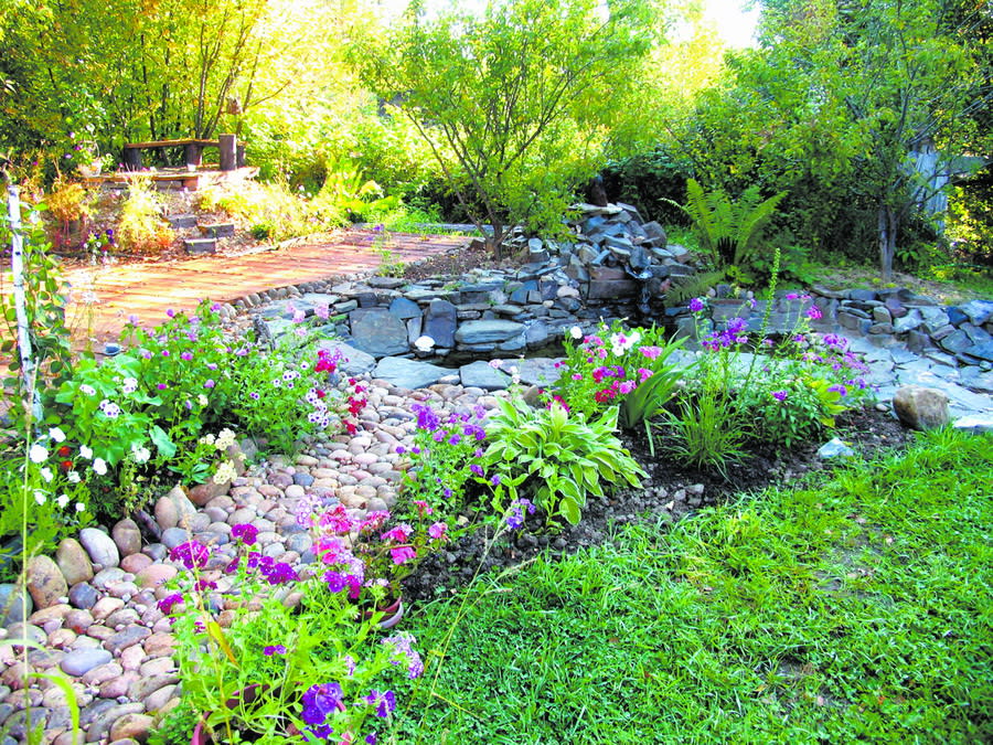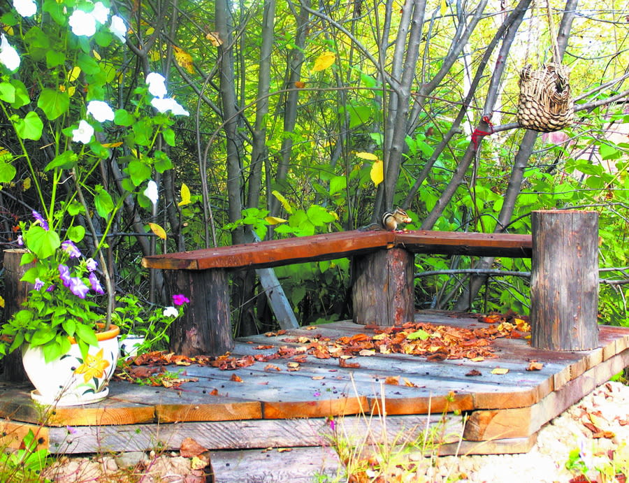 Летом в пору цветения ирисов, пионов, лилий в наш сад часто приезжают дети, внуки, друзья. Конечно же, появляется костёр, затем шашлыки. Летом тепло, и дружеский приём проходит в разных местах сада: на газонах, между цветочными клумбами, под берёзами. Но с появлением водоёма центр внимания переместился к нему, и я решила расположить место созерцания и общения возле него.