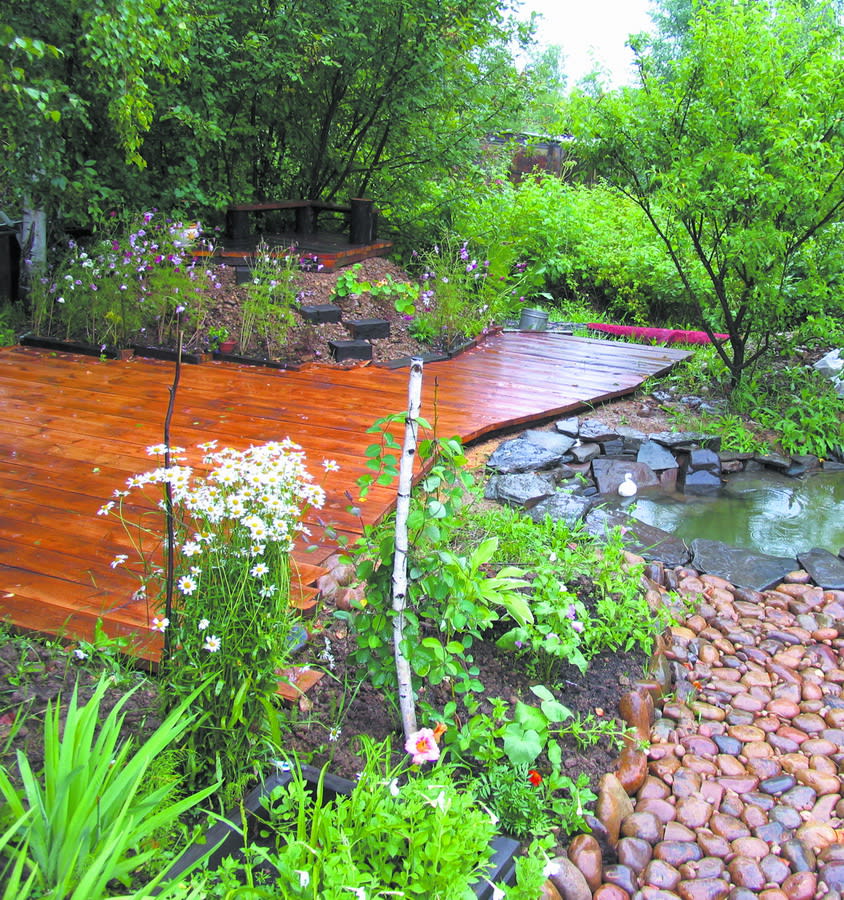 Затем вокруг горы с выходом к водоёму мы сделали большой деревянный помост (22 м2), плавно переходящий в тротуар и ведущий к кустам смородины и далее в сад. Он был задуман как столовая на открытом воздухе. Для этого мы выносим пластиковые столы и стулья, но стоит их отодвинуть, и помост превращается в прекрасную танцплощадку для внучки и её друзей. Расположен он под большими берёзами, которые дают тень и являются естественным пологом от небольшого дождя.