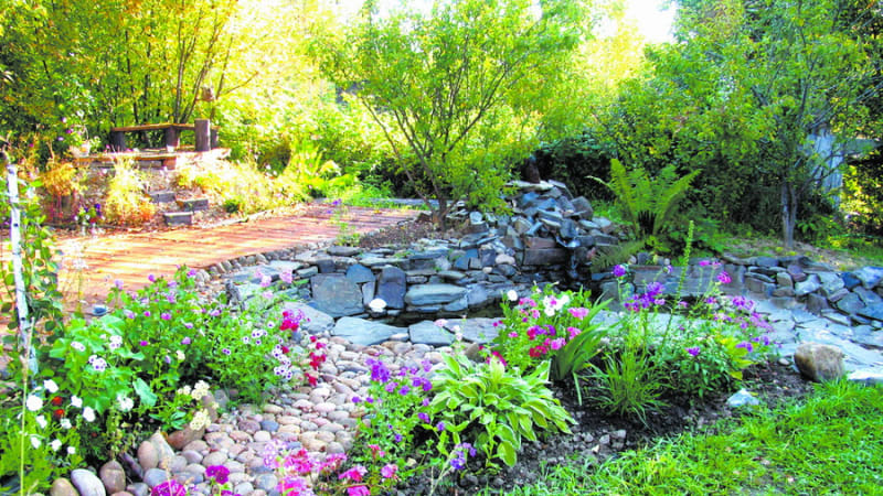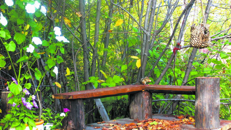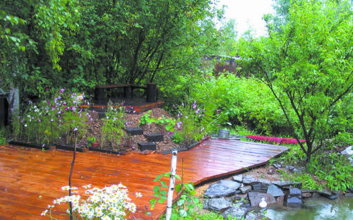 От котлована нашего «озера» остались две больших горы грунта – гравий с глиной. На одной мы уже соорудили скалу с водопадом, а другую перенесли на 2 метра дальше, под большой куст черёмухи и берёзы. Вершину горы разровняли и построили открытый павильон (всего 1,5 м2), вместо крыши над ним я связала и сформировала ветви черёмухи. Кажется, что это немного, но даже на этой крохотной площадке мы сделали лавочки для трёх человек и поставили два чурбака для «чайно-кофейной церемонии». На вершину нашей горы ведут пять ступенек из отдельных деревянных брусков. Вот и название гора получила «Фудзияма», что вполне естественно, так как японские сады строились на старых традициях китайских садов, а у нас это уже сибирский сад с берёзами, черёмухой, елями и яркими крупными цветами.