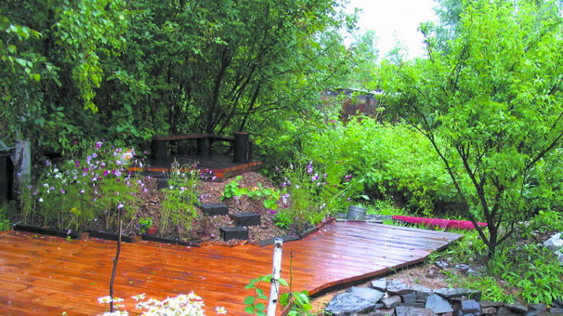 К строительству помоста мы подошли со всей ответственностью: разровняли почву, уложили лаги по периметру и в середине. Доски – сороковку – муж отстругал так, чтобы не было заноз, они стали гладкие, «тёплые и мягкие». Сколотили доски в расчёте на то, что они просохнут и между ними останутся щели для вентиляции. Уже готовый помост пропитали специальным покрытием для дерева, какое в большом ассортименте продают сегодня во всех строительных магазинах. По периметру помоста уложили камни, чтобы закрыть лаги и просвет между землёй и полом. Вокруг горы высадили цветы, а со следующего сезона она будет зарастать флоксом шиловидным, будрой и злаковыми.
