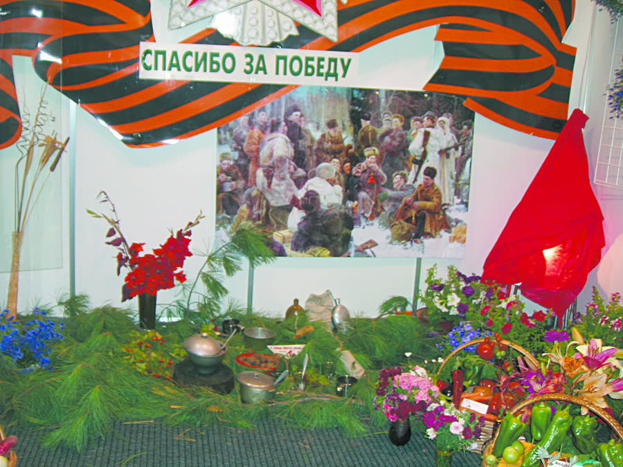 Каждый стенд интересен по-своему. Я коротко остановлюсь на экспозициях клубов садоводов, ведь именно они отвечали главной тематике выставки – демонстрации достижений в производстве сельхозпродукции. И каждый клуб раскрыл эту тему по-своему. Например, иркутский клуб «Лето» посвятил свою экспозицию юбилею Победы: картина войны, трава, варёная картошка, солдатский котелок с кашей – на заднем плане, и красивые букеты, нарядные корзины ярких овощей – на переднем. Нельзя не оценить творческий подход к делу: и продукцию показали, и о главном напомнили… И всё это благодаря Дине Васильевне Золотухиной, организатору и вдохновителю всех добрых дел в клубе.