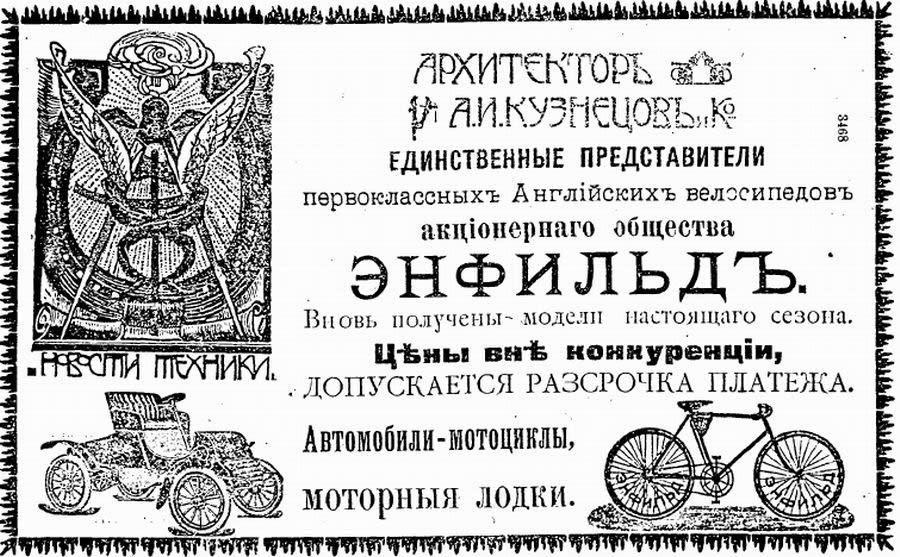 Иное дело чиновники уровня архитектора А.И. Кузнецова: в 37 лет дослужившись до статского советника, Алексей Иванович вышел в отставку – и сейчас же учредил свой торговый дом «Архитектор А.И. Кузнецов и Ко». Выпускник Петербургской академии художеств, украсивший город «Грандотелем», особняком Бутина и другими замечательными зданиями, давно уже тяготился узкими рамками, в нём рядом с талантливым зодчим вырос не менее талантливый коммерсант, и он только ждал выхода! Отыскался и замечательный компаньон Совалёв, имевший сношения с первоклассными европейскими фирмами, и вскоре распахнулись склады с прекрасным асфальтовым толем для крыш и фундаментов, шведским картоном и вообще всеми необходимыми для строительства материалами. В расположенной неподалёку технической и комиссионной конторе можно было быстро оформить заказ на возведение нового здания, архитектурный надзор, определение стоимости строения. Кроме того, фирма Алексея Ивановича стала единственным поставщиком первоклассных английских велосипедов акционерного общества «Энфильд», новейших моторных лодок и автомобилей-мотоциклов. В 1906 году «Архитектор А.И. Кузнецов и Ко» стала полномочным представителем Всеобщей компании электричества, а значит, серьёзным претендентом на устройство в Иркутске электрической станции. В середине апреля 1906 года Алексей Иванович увлечённо рассказывал об этом в городской думе, а чуть более месяца спустя его отпевали уже в Чудотворской церкви…