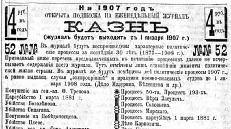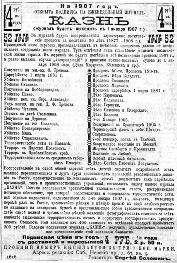 – Товарищи из Петербурга пишут, что в этом еженедельнике будут подробнейшим образом представлены все крупные политические процессы и все выдающиеся экспроприации, – торжественно возвестил сам Сократ. И даже зачитал: «Подробности этих взаимно переплетающихся и друг друга дополняющих проявлений революционного движения в России составляют основную задачу нашего журнала «Казнь». Помимо исполненного чрезвычайной увлекательности текста все подписавшиеся до 1 января 1907 года получат чрезвычайно ценную премию в виде роскошно изданной коллекции фотографических снимков со всех наиболее выдающихся террористических актов и портретов государ-ственных преступников. Стоимость этой коллекции из 400 снимков в отдельной продаже превышает 200 руб., годовым же подписчикам журнала «Казнь» весь альбом достанется совершенно бесплатно».