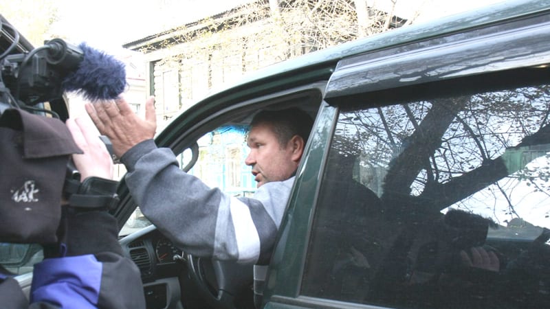 Самого «борца с режимом» пресса обнаружила сзади разрушаемого дома: он собирался куда-то уезжать и уже из салона своего авто, назвав представителей власти сволочами, сообщил: