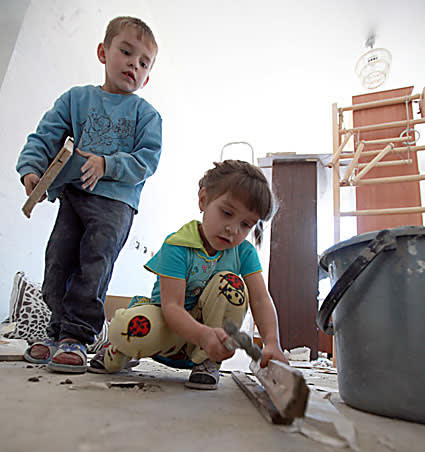 Ирину Шарафееву, многодетную мать, мы встретили на площадке. Женщина, подумав, что вновь приехало телевидение, поначалу смутилась – не хотелось попадать на экран в рабочей одежде. Её семья делает ремонт своими силами, даже малыши «помогают»: когда мы вошли в комнату, застали маленького Ваню на стремянке, а его сестрёнку – с молотком в руках.