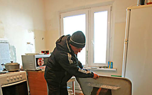 Как минимум одно замечание есть у её соседа Александра Павловича. Несмотря на то, что отопление в дом давно подано, в его квартире всё равно до сих пор включены обогреватели. «Днём пока тепло, а ночью, если проходишь на кухню, всё равно прохладно, – объясняет он, показывая разводы на потолке. – Теплоизоляцию положили на сырой после дождя потолок, конденсат как даванул в квартиру. Соседка, многодетная мать, со слезами вышла: говорит, что делать, ребятишки точно переболеют. У неё аж вода капала с потолка».