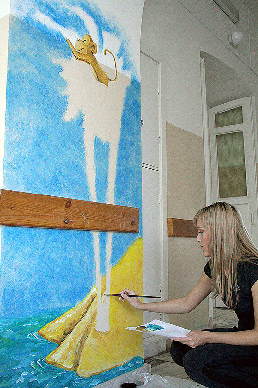 А ещё со «Стеллариумом» недавно начала сотрудничать 22-летняя Даша Сенюк. Саму Ирину Худаеву она никогда в жизни не видела, просто откликнулась на просьбу той расписать стены детского онкоотделения. Стены расписала, а потом попросила разрешения у завотделением приходить к детям, чтобы рисовать с ними.