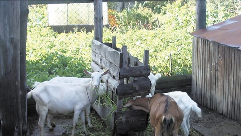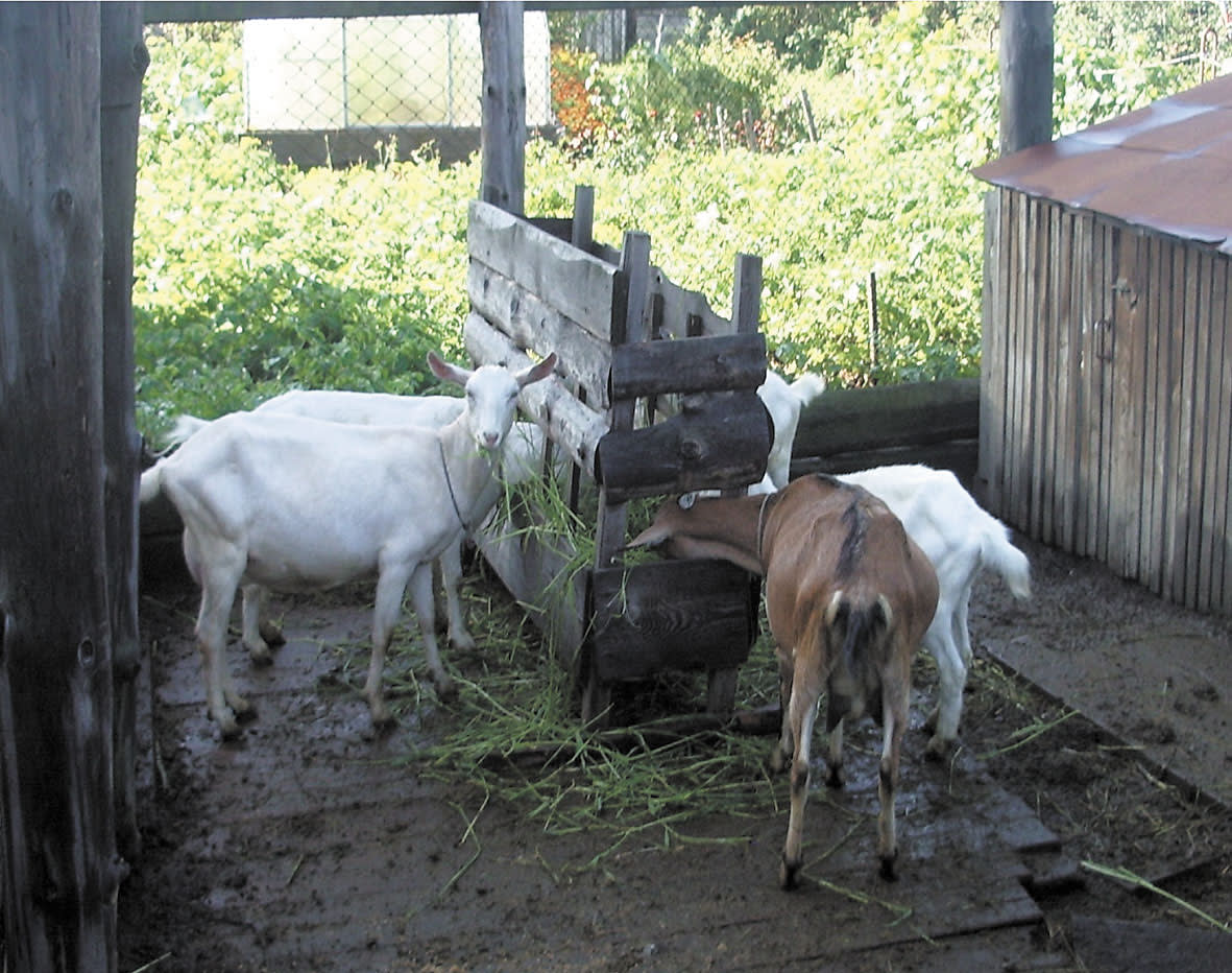 Наши гибридные матки дают до 5-6 литров молока жирностью около 6%. Такие показатели возможны только при полноценном сбалансированном кормлении. Нужно иметь в виду, что одной козе в зимний период необходимо в сутки не менее 2 кг сена, концентратов – 0,3-0,5 кг на 1 литр молока, сочных кормов – 2-3 кг. Сено можно заменять овсяной соломой, но не более 50%. Треть сена полезно заменить хвойным лапником, но до начала сокодвижения (у хвойных это конец марта). Неплохо в зимний рацион включать веники лиственных пород: клёна, осины, берёзы, ивы, вербы, тополя и др. При кормлении цельным зерном нужно учитывать, что сухое зерно у коз плохо переваривается. Поэтому зерно лучше давать в дроблёном или запаренном виде. Наши козы очень любят отруби, замоченные в горячей воде, это прекрасный белковый корм. Зимой желательно, чтобы всё питьё было тёплым. Это даст возможность избежать простудных заболеваний, выкидышей, маститов даже в неотапливаемых стайках.