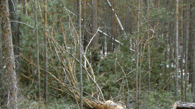 Стена леса, казавшаяся с магистрали нескончаемой, оказалась не толще ста метров. Вместо стройных растущих сосен мы увидели варвар-ские вырубки – старые криминальные лесосеки и завалы из брошенных деревьев. На некоторых сохранилась зелёная хвоя. Значит, они были срублены относительно недавно, в самом конце минувшего лета или в начале осени. Яркими оранжевыми пятнами светится в лучах поднявшегося солнца уже засохшая, но ещё не осыпавшаяся хвоя деревьев, спиленных прошлой зимой. Беспомощно тянут в небо чёрные корявые сучья деревья, поваленные три-пять лет назад.