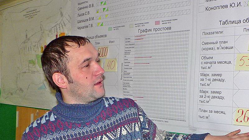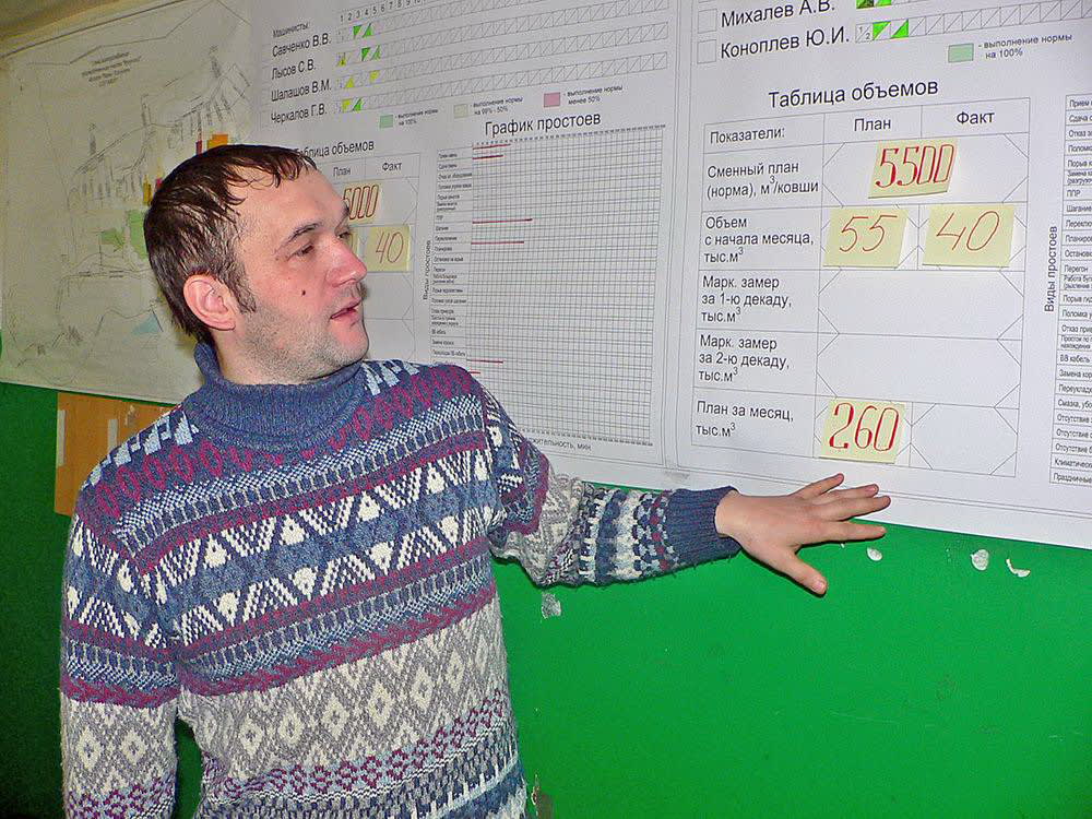 В ноябре начальник второго горного участка Евгений Дмитриев в Черемхове на базе местной ТЭЦ-12 проходил обучение по курсу, посвящённому бережливому отношению к производству, его методам и инструментам. В конечном счёте новые знания подразумевали рациональное отношение к производству, направленное всё на то же повышение производительности труда, исключение потерь времени, повышение безопасности. По результатам учёбы он, с учётом специфики работы горного участка угледобывающего предприятия, начал внедрять у себя новую методику мониторинга работы горного оборудования. Суть нововведения, как и всё гениальное, проста. Для начала были взяты три однотипных шагающих экскаватора ЭШ-20/90, выполняющих вскрышу в забое участка (кстати, именно на одном из них была внедрена система 5S). Для каждой машины была составлена специальная схема, содержащая фамилии всех машинистов, работающих в разные смены, графики их выходов на работу, цифры ежедневного и месячного плана, специальные поминутные графики простоев экскаваторов с указанием их причин. Ежедневно в схему вносятся дополнения, основанные на докладах машинистов о выполнении работы за прошедшие сутки. Главное достоинство схемы – это её наглядность. Для оценки результатов каждой смены был применён принцип «светофора». Хорошо отработала смена – ячейка в схеме закрашивается зелёным цветом. Не очень хорошо – жёлтым. Если были простои или поломки и план смены не выполнен, ячейка штрихуется красным. Ежедекадно в схему вносятся маркшейдерские данные об объёмах перемещённого в отвал грунта. Достаточно даже беглого взгляда на схему, чтобы детально представить себе полную картину выполнения вскрышных работ: как идёт выполнение плана, на что нужно обратить особое и первоочередное внимание. Разумеется, Дмитриев с мастерами своего участка по окончании месяца будет проводить детальный анализ ситуации – это их забота как руководителей – и делать соответствующие выводы. Но это в конце месяца. А каждый день всем сотрудникам участка – машинистам экскаваторов, их помощникам, электрослесарям – схема наглядно демонстрирует, кто и как работает. Несмотря на маленький срок нововведения, на участке уже вошло в привычку обращать внимание на схему, сравнивать итоги смен. Каждому ведь хочется в лучших быть, а не в отстающих, не привыкли настоящие горняки отлынивать. А схема заставляет ещё больше подтягиваться. То есть и моральный стимул налицо. Тем более что по согласованию с руководством разреза для лучших предусмотрено премирование.