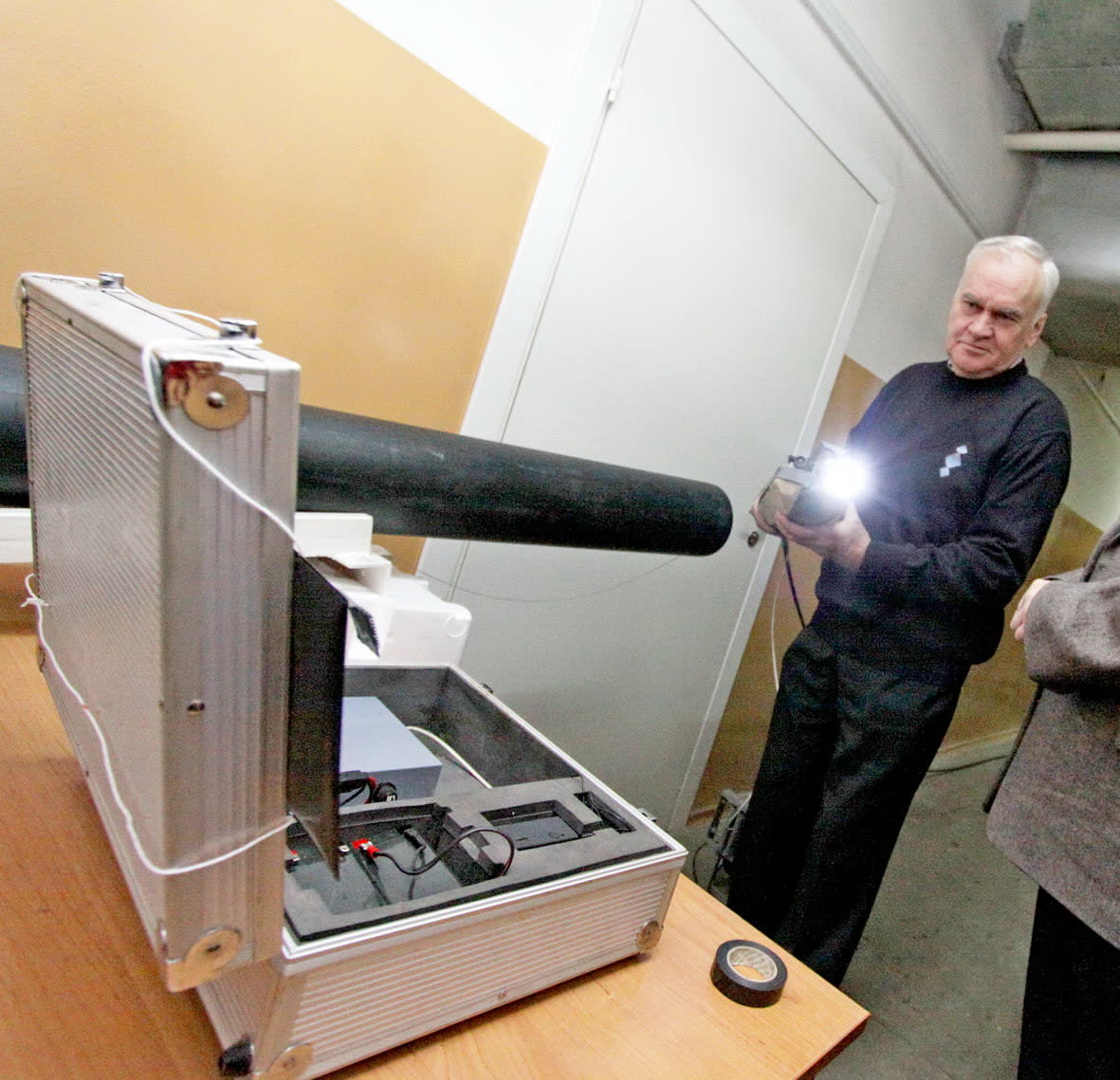Следующая точка инспекции – научно-производственная фирма «Восток-Тор», которая больше пяти лет производит диагностических роботов для трубопроводов. В арсенале компании – диагностические и ремонтирующие, самоходные и плавающие роботы. Нам представляют новую разработку – плавучего робота, он обошёлся городу в 389 тысяч рублей. Главная задача агрегата – диагностика канализационных труб. Опытный образец представляет из себя кусок пенопласта, где установлены светодиодные лампы, аккумулятор и видеокамера, с которой вся информация поступает на специальный регистратор, а затем переносится в компьютер. Владимир Жилкин, главный инженер научно-исследовательской части ИрГТУ, растолковывает нам, что плавучие свойства робота позволяют узнать, в чём причина аварии и на каком участке она произошла, не проводя раскопок по всей длине трубы. Он с удовольствием показывает, как робот метр за метром проходит трубу, наполненную жидкостью, и подчёркивает, что он может работать даже в трубопроводах с техническими жидкостями. Создатели робота не скрывают, что за рубежом есть подобные технологии, только стоят они больших денег. Аппаратом уже заинтересовался Водоканал.