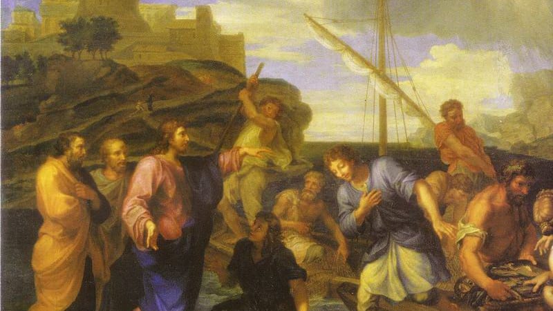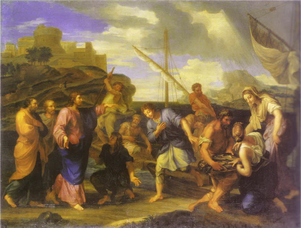 Сюжет картины повествует о призвании апостолов Иакова и Иоанна. «…Оттуда идя далее, увидел Христос других двух братьев, Иакова Зеведеева и Иоанна, брата его, в лодке с Зеведеевым, отцем их, починивающих сети свои, и призвал их…» (Евангелие от Матфея).