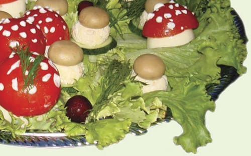 Оформление блюда. Берём большое круглое блюдо. Выкладываем его свежими листьями салата. Сверху устанавливаем подготовленные «грибочки». Украшаем зеленью, вишенками, клюквой, маслинами – всем, что подскажет ваша фантазия. Блюдо не только эффектно выглядит, но ещё и очень вкусно! Гости будут в восторге!!!