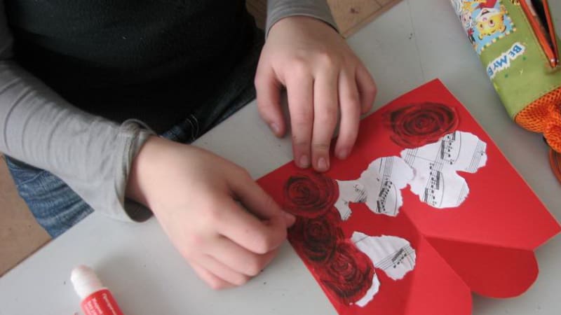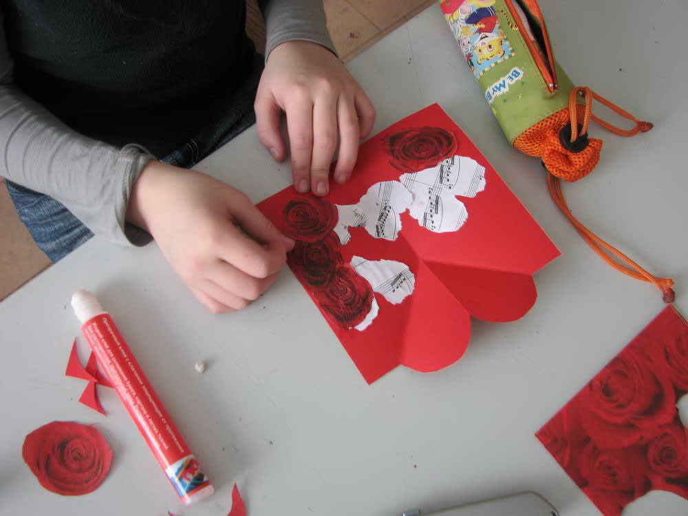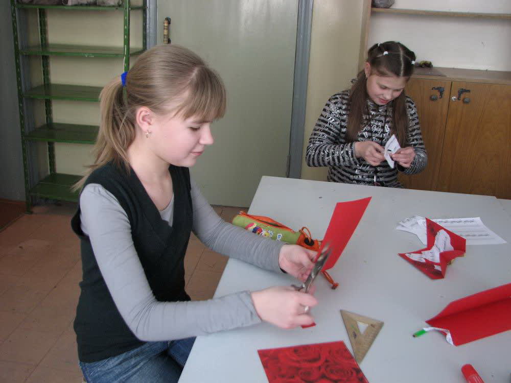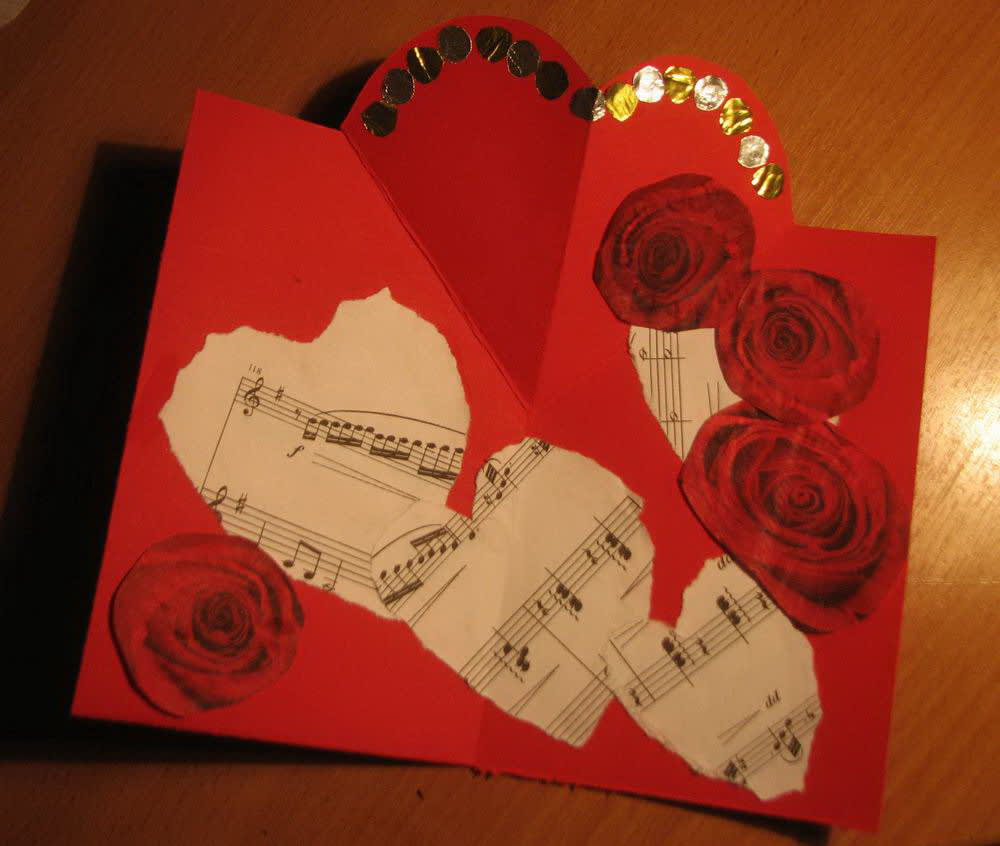 В этом году ребята из детской художественной школы № 3 решили подойти к празднику не формально, а как люди творческие, с фантазией. Решили: если уж дарить валентинку, так настоящую, в которую действительно вложены чувства. Предлагаем последовать нашему примеру. Для этого нужно взять лист картона, бумаги, согнуть вдвое. Вырезать квадратик в углу с раскрывающейся части открытки. Согнув верх валентинки под углом, разогнуть и вырезать форму сердечка. А потом это сердечко загнуть во внутреннюю часть валентинки. Украсить внутри сердечко подручными материалами. Можно активно применить творческую фантазию. Ребята использовали ноты, фантики от конфет, салфетки. Внешнюю часть тоже нужно украсить. Валентинка готова, осталось только подписать внутри и подарить друзьям.