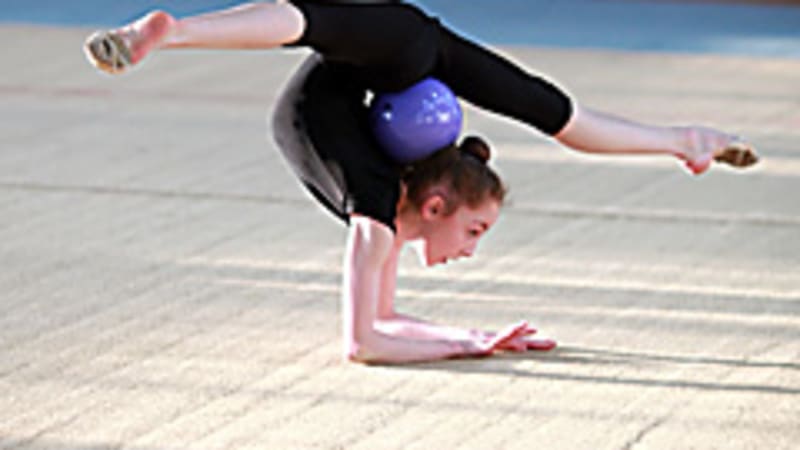 Из группы спортсменок к нам подходит длинноногая и стройная Ксения Ефремова, ей всего 13 лет, но она уже кандидат в мастера спорта по художественной гимнастике. Ксения предлагает сначала посмотреть на свою тренировку.