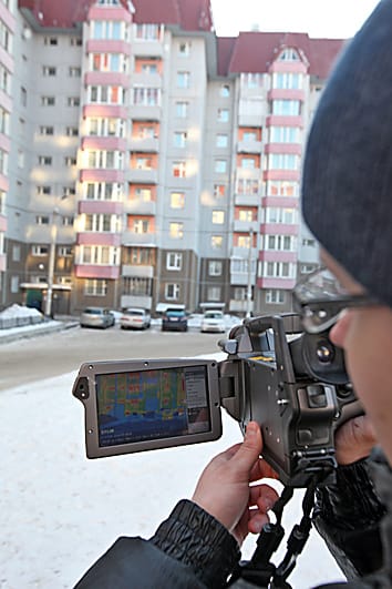 «Сибирскому энергетику» удалось понаблюдать тепловизор в действии. Выходя с прибором, внешне напоминающим небольшую видеокамеру, во двор печально известного из-за сгоревшей крыши дома по улице Баумана, 227, Владимир Гладков пояснил, что лучше всего снимать рано утром либо в пасмурную погоду, поскольку солнце сильно искажает данные. Установив параметры условий съёмки – температуру наружного воздуха и относительную влажность, специалист выбрал угол дома, куда падала тень. «Видите, швы идут жёлтые, так же как подъездные окна. Небольшие жёлтые участки на панели – арматура либо металлические крепления утеплителя», – по ходу дела объясняет инженер. В нашем случае нельзя однозначно сказать, соответствуют теплопотери нормативу или нет, нужно провести анализ термограммы. Для этого существует специальное программное обеспечение.