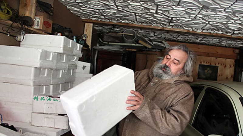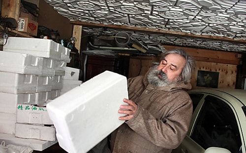– Мне его с магазинов подгоняют. Приеду – девчата одну-две коробки дают. На свалку приезжаю – бичи помогают. Всего надо четыреста коробок. У меня уже есть где-то триста. За счёт пенопласта бочка и будет держаться. Иначе всё, до свидания!