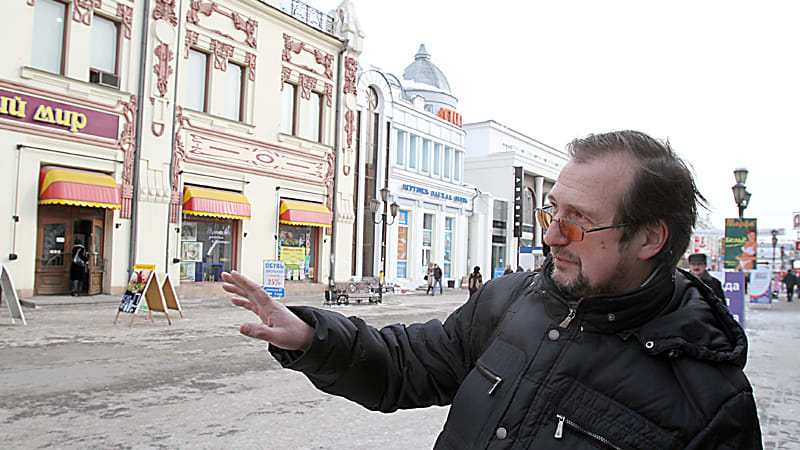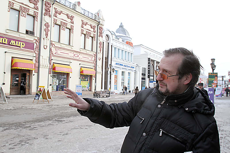 Вот мы дошли до ещё одного образца безвкусия. Я и сам могу применить в своих проектах стекло. В том случае, если нет среды. Есть такой проект: стоит одно кирпичное здание, очень красивое, и оно обрамлено тёмным стеклом. Называю это реквиемом по царицынской архитектуре. Но нет причин устраивать траур по архитектуре иркутской! К счастью, вот это, – кивает на кинотеатр «Второй этаж» Сена, – вещи обратимые. Ужасные фасады, но можно всё это переделать по-человечески.