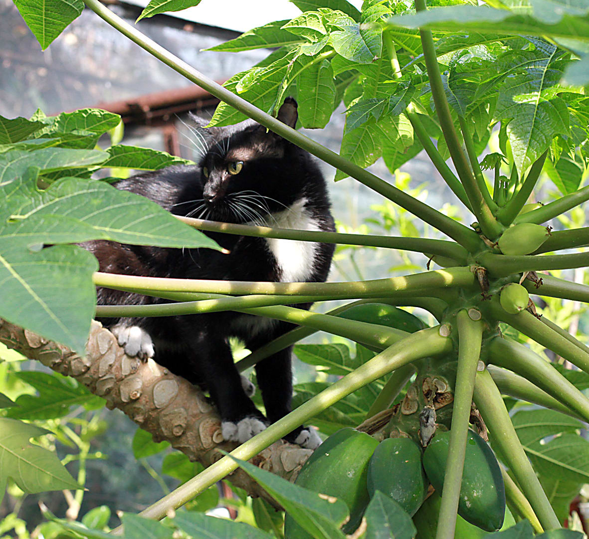 Под листьями, тесно прижавшись к стволу на манер кокосов, прячутся тёмно-зелёные плоды, похожие на крупные груши. В этот момент на ствол прыгает чёрно-белая кошка и начинает позировать.