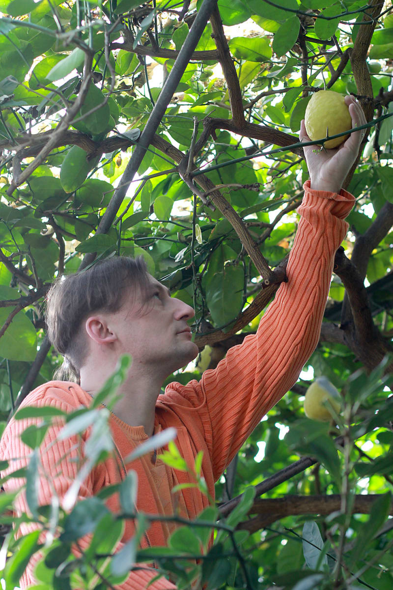 – Нет, это наш сорт, иркутский, гибрид с грейпфрутом. У него толстая кожица и очень высокое содержание витамина С. И это не самые крупные плоды – бывают размером с голову маленького ребёнка, самый большой, который мы снимали в оранжерее, весил 1300 граммов. А цветочки – вон они, – показывает на спрятанные в листве мелкие белые соцветия. – Набрать девушке букет из них будет сложно. Но к концу недели они раскроются, и аромат будет стоять по всей оранжерее. Аромат изумительный… На самом деле лимон зреет от цветка до плода девять месяцев – столько женщина вынашивает ребёнка. Поэтому на одном дереве вы видите и цветы, и созревшие плоды.