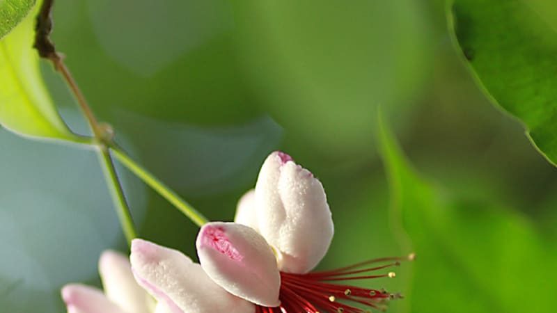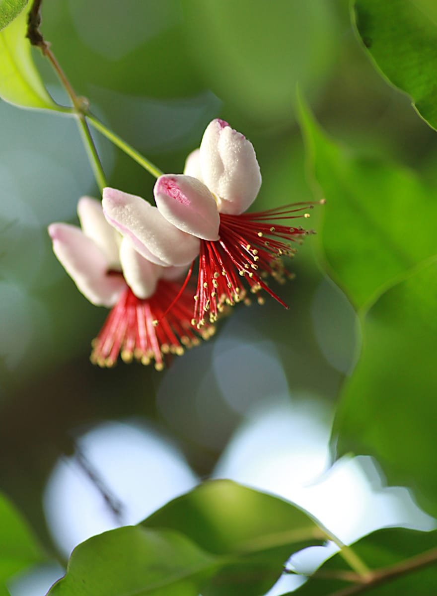 – А у нас сейчас цветёт фейхоа. У него очень вкусные и полезные плоды – в них большое количество йода, и если бы он рос у нас в садах, то у людей не было бы проблем со щитовидной железой. Сейчас он только зацвёл – вам же цветочки нужны? Вон они – под самым потолком в листве прячутся маленькие, но очень красивые фиолетовые с жёлтым цветочки, похожие на птичек колибри. Плодоносит он в начале лета.