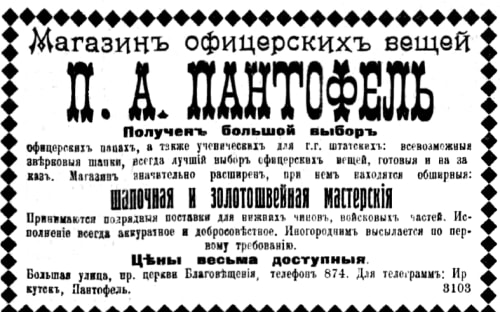 Правда, несколько сотен экземпляров появились в Иркутске, в недавно открывшемся военном книжном и географическом магазине. Он занял довольно большую площадь в пассаже Юциса, и полковник Яровец с удовольствием посетил его вместе с супругой, вызвал хозяина и сказал ему несколько слов о «подвижничестве, совершенно необходимом при общей некультурности края». Книготорговец стушевался и отвёл гостя в сторону: