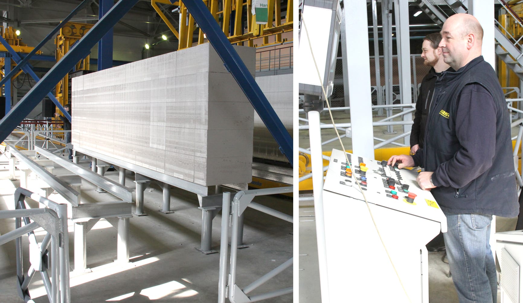 Основные материалы для производства газобетона – песок, который везут с Алзамайского месторождения, цемент, известь и гипс, доставляемые из Ангарска, а также алюминиевая паста, которую завозят из Шелехова. Сырьё смешивается с водой и заливается в стальную форму, где происходит реакция воды, алюминиевой пудры и гашение извести. Выделяющийся водород образует поры, в результате чего смесь поднимается как тесто. Когда газобетон начинает твердеть, с застывшей смеси срезают неровную верхушку, а оставшуюся массу разрезают на блоки равного размера. Полученные элементы проходят тепловую обработку в автоклаве. Газобетон – современный, безопасный, экономичный, экологичный и долговечный материал для строительства. Его качества оценили практически во всём мире, а практичные немцы строят 70% частных коттеджей именно из газобетонных блоков. В Белоруссии сейчас уже возвели девять заводов по производству этого стройматериала, рассказал Сергей Брилка. Сейчас ведётся строительство десятого.