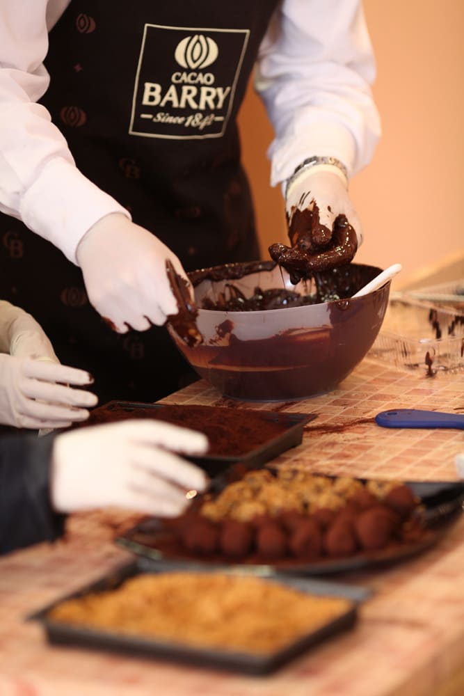 «Сейчас начнётся самое интересное – глазировка конфет, глазировать мы будем вручную, – объявил повар. – Мне нужны два добровольца». Добровольцами оказались два самых юных участника мастер-класса – Иван и Света. Повар достал заранее заготовленные шарики ганажа, распустил на паровой бане 70-процентный шоколад. Тёмный шоколад создаёт хрустящую корочку, а внутри конфетка остаётся нежной-нежной. Повар сделал «одеяло» из какао, достал вафельную стружку.