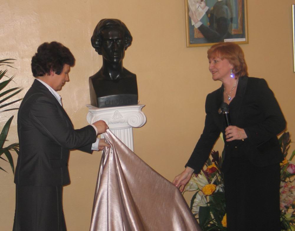 Торжественная церемония началась с события, которое, без сомнения, красной строкой войдёт в историю музыкального колледжа, – открытия великолепного бюста Фридерика Шопена в холле учебного заведения. Директор колледжа Анастасия Дурбажева, представители польской стороны под дружные аплодисменты собравшихся сняли покрывало – и вот он, «нежный гений гармонии», как назвал Шопена другой гениальный музыкант 19 века, Ференц Лист, перед нашими глазами. Здесь он будет отныне встречать обитателей храма музыки. Именно так хочется назвать образовательное учреждение, из стен которого вышло много блистательных музыкантов, соединивших свою творческую судьбу с музыкой Шопена. Именно по их инициативе при поддержке министерства культуры и архивов области, Генерального консульства Республики Польша, а также заслуженного артиста России Дениса Мацуева год 200-летия композитора было решено отметить присвоением колледжу высокого имени.