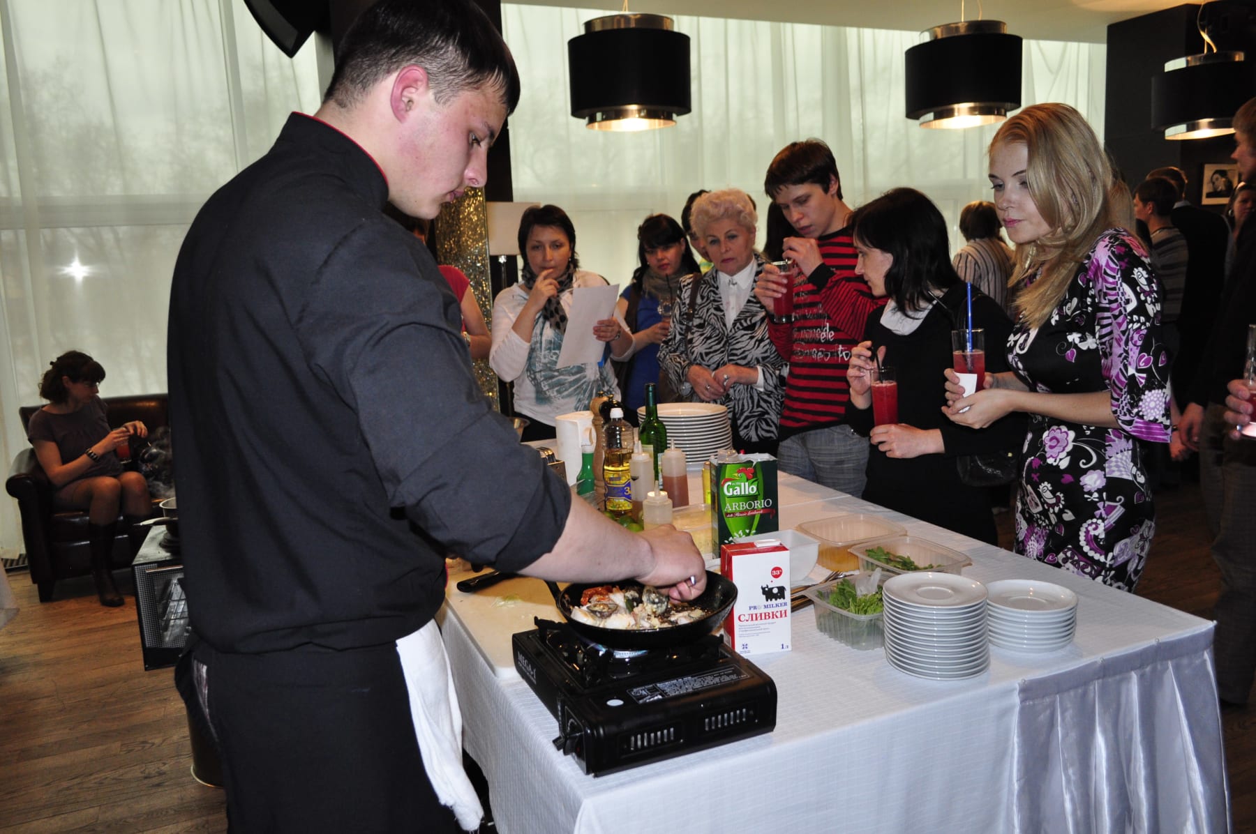 – Так, мальчики, жду чизкейк! Ещё не готов? – волновалась участница мастер-класса. Как признался позже один из поваров, «кто-то пришёл поесть на халяву, кто-то – научиться». С ним было сложно не согласиться: гости курсировали между четырьмя столами, задерживаясь там, где наливали алкогольные коктейли. Тем временем шефы работали почти что в полевых условиях – на непривычно маленьких столах и плитках. В процессе объяснения все они без исключения говорили «блюда» с ударением на последний слог.