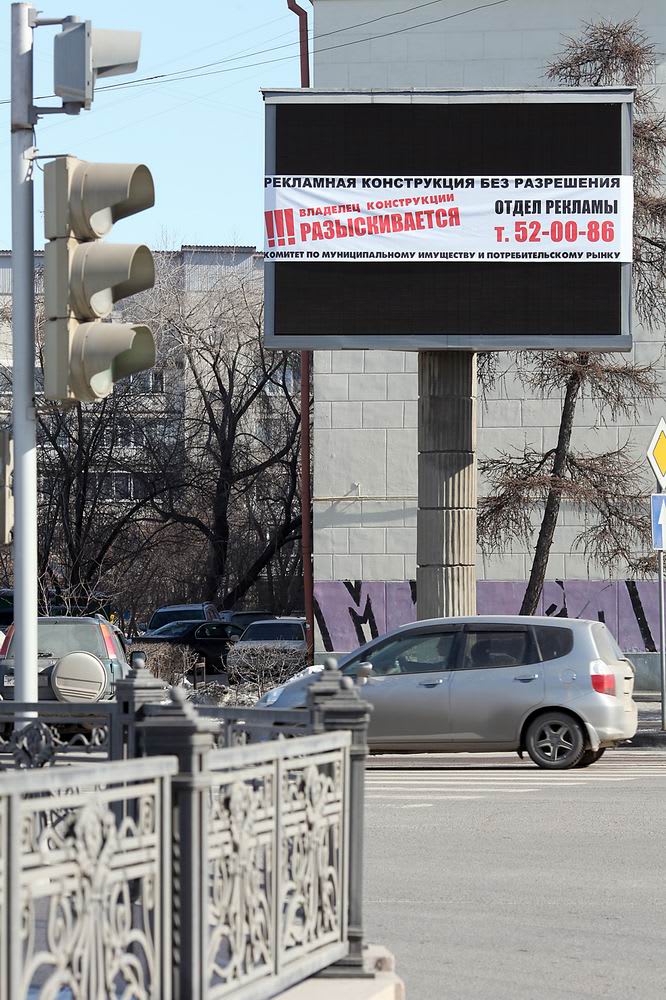 – На улице Ленина некоторые конструкции установлены по договору с мэрией, а некоторые были поставлены нелегально. Мы это обнаружили и обязали хозяев платить городу за аренду земли до тех пор, пока эти щиты не будут снесены – глупо же отказываться от поступлений в бюджет, – пояснил Евладов, сам бывший коммерсант (ранее он работал исполнительным директором в иркутском офисе оператора наружной рекламы «Gallery»). – Однако владельцы щитов предупреждены, что, когда мы займёмся очисткой района от незаконных конструкций, их придётся лишиться.
