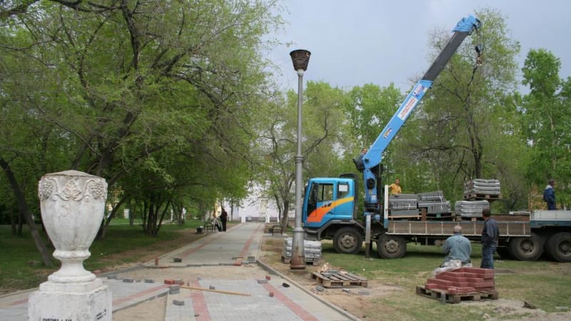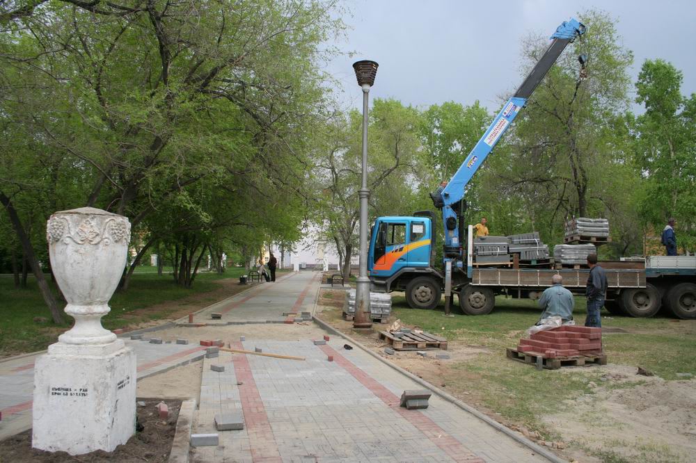 Изыскания на территории парка начаты ещё 26 апреля. Поскольку проект, предоставленный администрацией города, оказался сыроват, потребовалась большая подготовительная работа и геодезические изыскания: нужно было учесть разуклонку и определить, куда дренировать воду. Собственно к ремонтным работам подрядчики приступили 10 мая. Начали выборку грунта, спланировали дорожки по уровню. Сейчас идёт укладка плитки: всё по стандарту и самым строгим нормативам, на смесь песка и 400-го цемента, идеально ровно. Планируется, что, если погода не помешает, работы будут завершены к июлю.