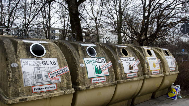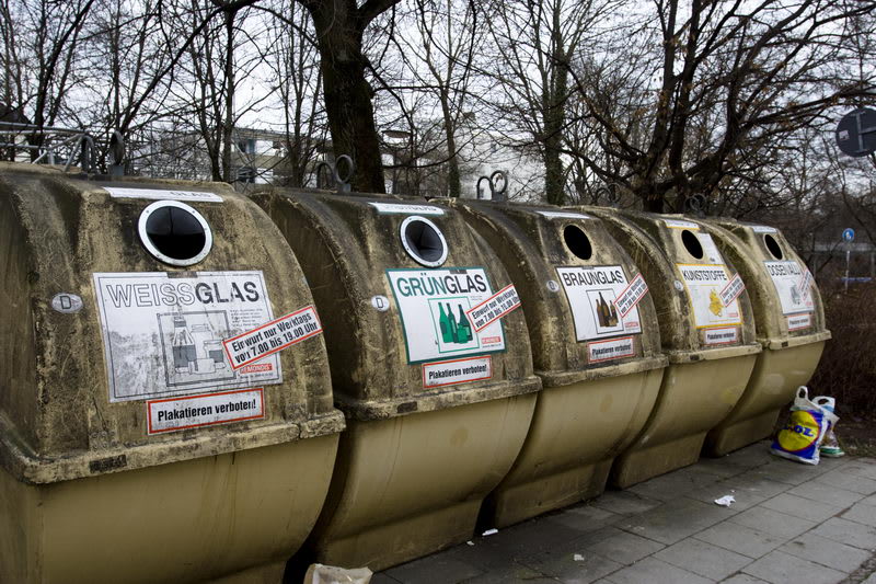 Германия пошла на пути селективного сбора мусора ещё дальше. Дизайн контейнеров может быть разным, но неизменным остаётся то, что для белого, зелёного и коричневого стекла здесь ставят разные контейнеры.