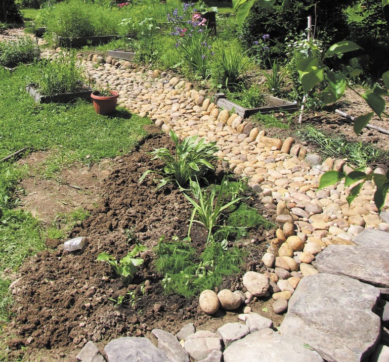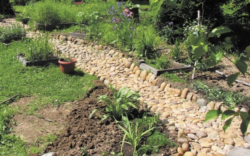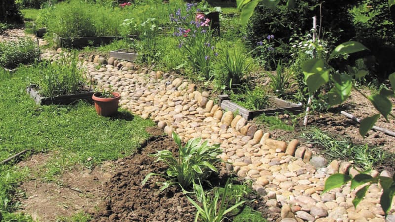 Песочные дорожки тоже очень красивы и естественны. В последние годы стали модными галечные дорожки – сухой ручей. Они ещё играют роль массажёра, что нам просто необходимо, так как большую часть года мы носим тёплую обувь. Устройство сухого ручья тоже трудоёмко, как, впрочем, и всё остальное. Чтобы его не затянуло травой, которую потом будет сложно удалять, не нарушив дорожки, можно проложить полиэтиленовую чёрную плёнку, предварительно сняв дёрн, а уже на плёнку засыпать гальку.