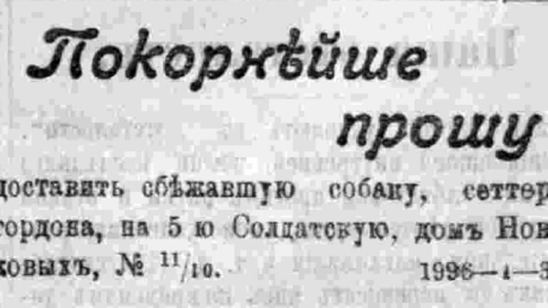 На другой день ветеринар, в самом деле, прочёл: «Передаётся на 4 месяца квартира в пять комнат, с обстановкой – за 65 руб. в месяц. Тут же продаётся ручная лисица полутора лет, уже имевшая помёт и пригодная для спаривания с охотничьими собаками соответствующих пород – за 25 руб. Желательно передать в хорошие руки, а охотнику – бесплатно. Тут же продаётся за 600 руб. сенбернар, со свидетельством, от премированного предка, получившего на выставках в России большую серебряную медаль, большой золотой жетон, приз министерства финансов и звание чемпиона».