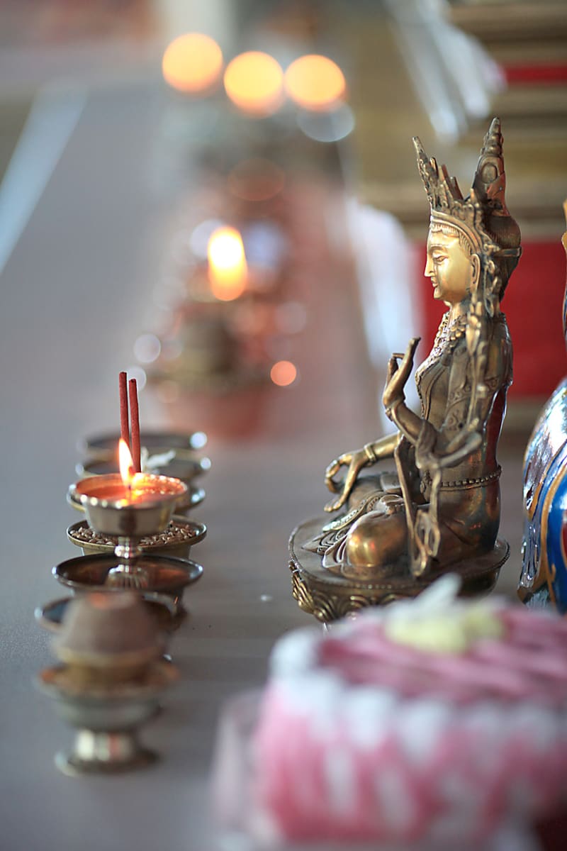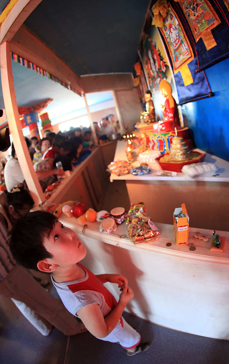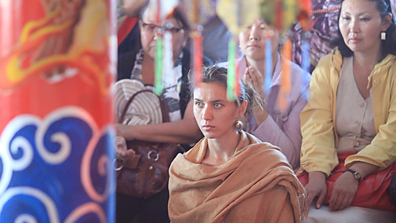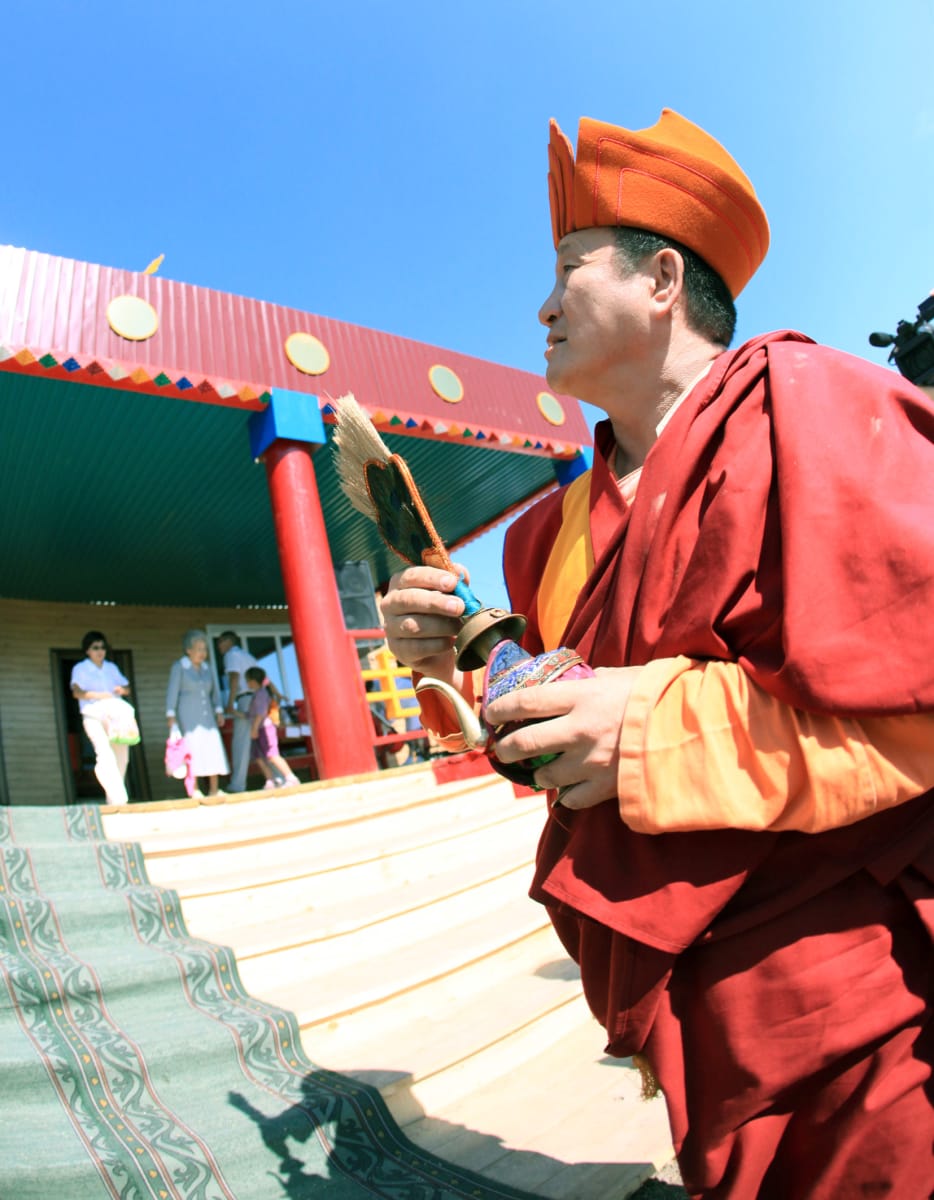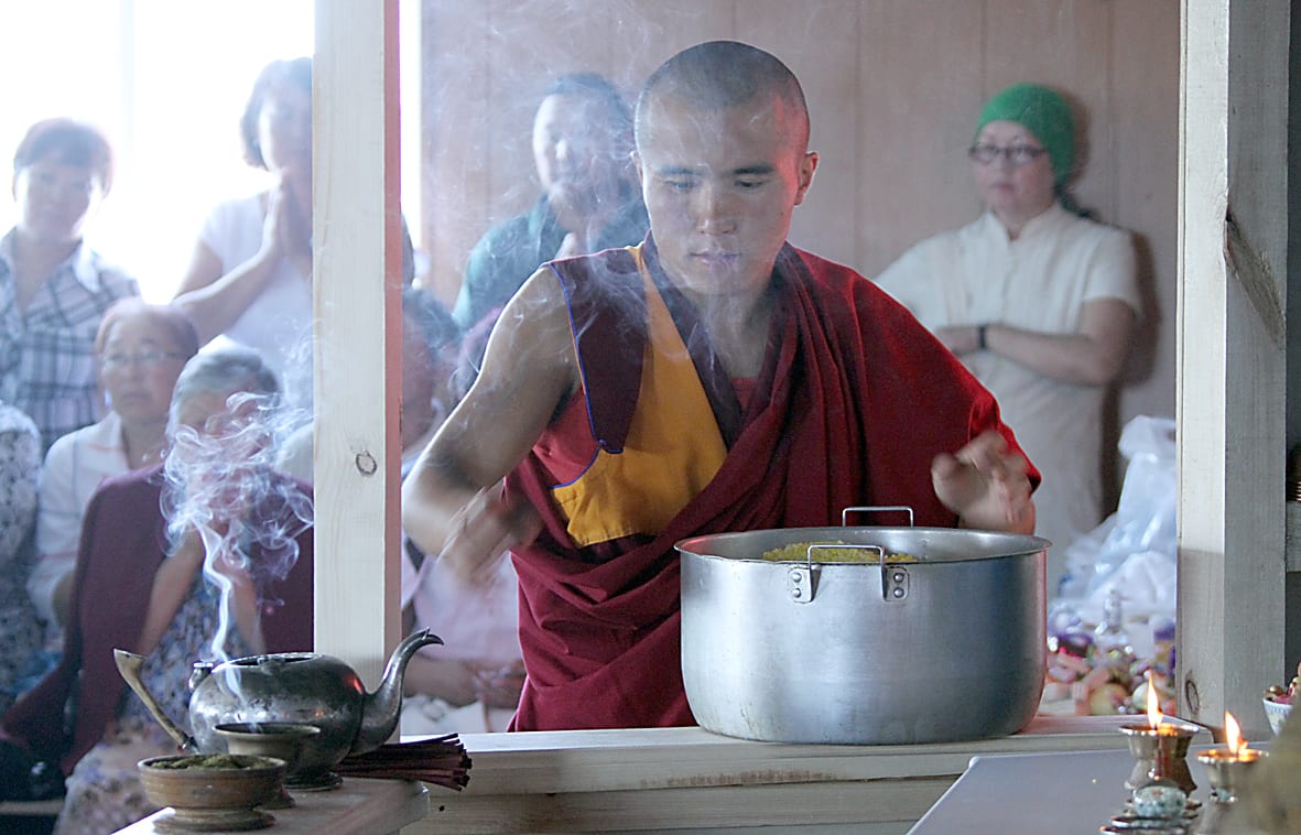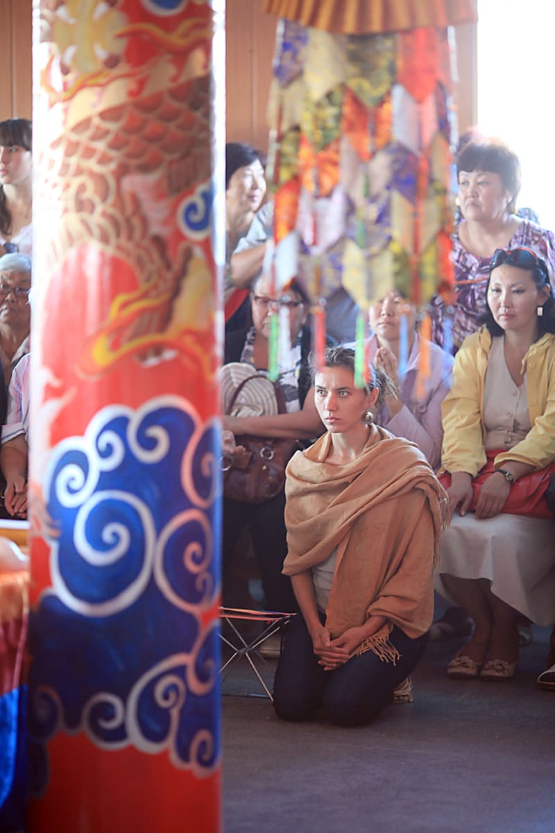 Торжественный молебен проходил очень демократично. Для тех, кто не поместился в основной придел храма, велась трансляция во двор через динамики – звукорежиссёр с видом опытного диджея хмурился и подкручивал настройки громкости. На просторном крыльце слева от входа люди составляли пофамильные списки семей, чтобы за них помолились ламы. Справа стоял стол с подношениями: как и в шаманистских обрядах, люди приносили белую пищу – водку и молоко, конфеты-печенюшки, фрукты и сыр. В соответствии с современными санитарными нормами слева на крыльце был смонтирован пандус для въезда инвалидных колясок.