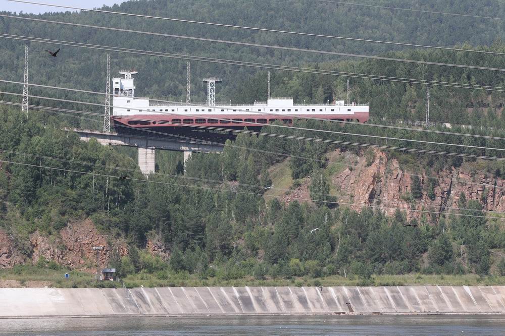 Не спеша с высокого гребня плотины по массивным рельсам прямо в воду невдалеке от пришвартованной баржи спустился судоподъёмник красноярского гидроузла. Обывателю он напомнит пятиэтажный дом с гигантской «ванной» шириной 17 метров, длиной около 90 метров и грузоподъёмностью до 2 тысяч тонн. Это единственное в мире инженерное сооружение, способное прямо с водой легко поднимать и опускать довольно крупные речные суда.