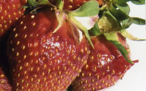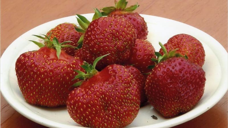 Берегиня. Новый среднепоздний сорт селекции Кокинского опорного пункта ВСТиСП. Красивый тёмно-зелёный полураскидистый куст с ягодами овально-конической формы с хорошо выраженным перешейком и отогнутыми чашелистиками. Первые ягоды очень крупные (размером 3х3,5 см), последующие помельче. Они тёмно-красные с полувдавленными семенами, блестящие, с плотной красной мякотью и вкусом настоящей лесной земляники. Только из-за одного вкуса стоит иметь такую ягоду в саду. Настораживает очень активное усообразование. Возможно, это издержки сильно удобренной почвы.