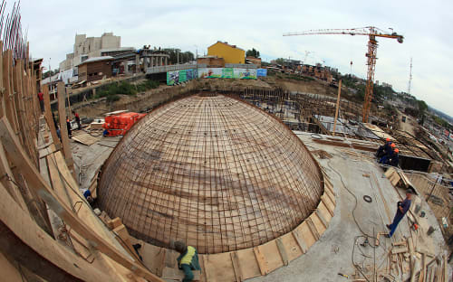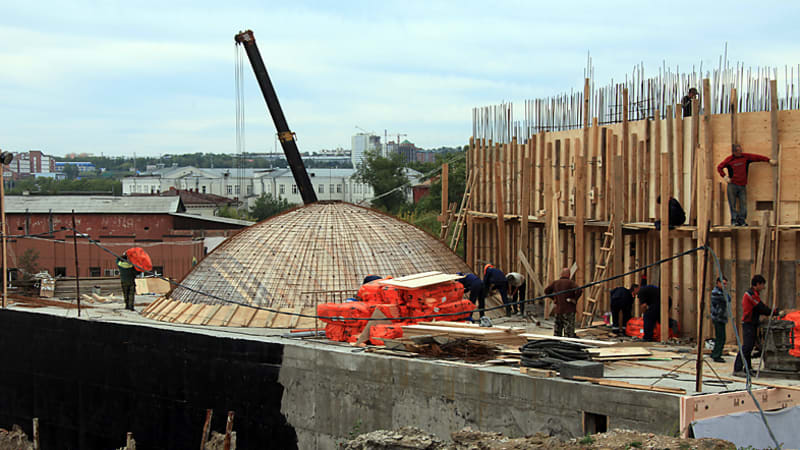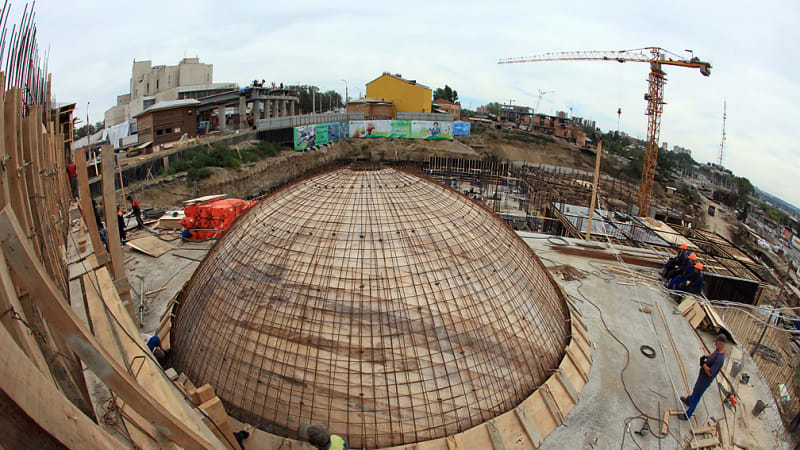 Если ехать мимо 130-го квартала, видно, как поднимается над землёй большое, выделяющееся из всей массы строящихся объектов сооружение – полусферический каркас будущего силового купола планетария. Как сообщили в минувший понедельник на оперативном штабе по подготовке к 350-летию, сейчас готов первый, или цокольный, этаж планетария (по отношению к улице Седова он подземный, по отношению к пешеходному бульвару – первый). Строители «выходят» на второй этаж. «Каркас уже стоит, армирование выполнено, – сообщили в руководстве строительной компании «Фотон». – Для нас это был необычный заказ, пришлось поднимать массу литературы, тщательно изучать, смотреть, как подобные сооружения делали до нас, какими были технологии изготовления куполов. Однако мы справились». В ближайшие дни начнётся заливка купола бетоном, на субподряде предприятие «Иркут-Инвест». Будут использоваться разные сорта бетона – заливать придётся в несколько слоёв. При заливке будет использовано таркетирование – напыление мелкодисперсного бетона под давлением. Бетонирование должно быть закончено к 1 сентября, после чего начнётся монтаж внешнего стеклянного купола.