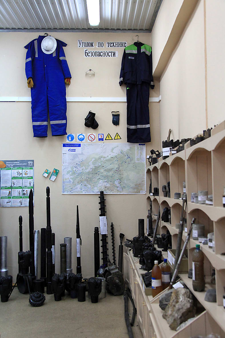 Пока идёт рассказ о свойствах нефти, мы постепенно переходим к инструментам, расставленным на полу вдоль стены и разложенным на полках. Здесь и долота, предназначенные для разрушения породы, и смахивающий на гарпун ёрш, с помощью которого извлекают упавший в скважину геофизический кабель, и фрезы для аварийных работ, и отдельные шарошки. «Это оборудование, которое работало на буровых, – подчёркивает наш гид. – Выставлять новое – слишком дорогое удовольствие, ведь в своё время одно долото стоило как автомобиль «Жигули».