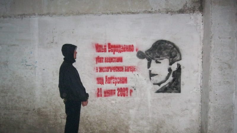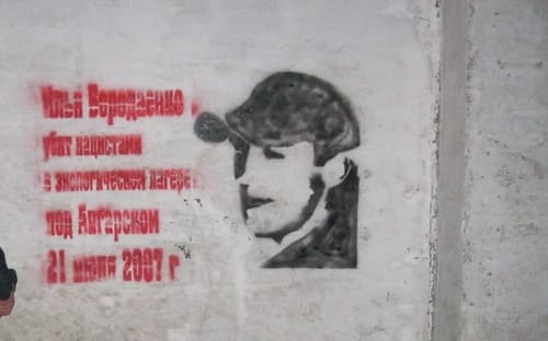 – Там можно найти и советы по изготовлению собственных рисунков, например как обработать фото для подготовки его к трафаретному изображению: фото должно быть на светлом фоне, контрастное; если это лицо, то с крупными чертами, рельефное. Так мы сделали трафарет Ильи Бородаенко, который погиб при погроме экологического лагеря под Ангарском 21 июля 2007 года, – рассказывает Матвей. – Это наш самый крупный на сегодняшний день трафарет, где-то метр на полтора. Это был портрет и надпись сбоку: «Убит нацистами в экологическом лагере под Ангарском». Мы сделали его на четвёртую годовщину – он появился на стенах Иркутска в этом году, в ночь на 21 июля.