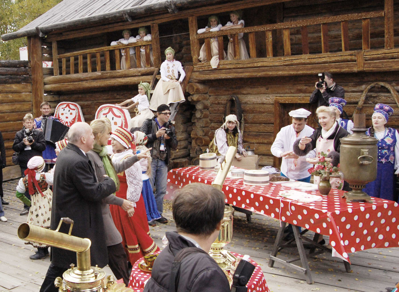 Прессу привезли в «Тальцы» на два часа раньше, поэтому она шаталась среди народных коллективов, наблюдая подготовку к торжеству. «Гогель-могель, гонобобель, кому в ухо, кому в глаз!» – лихо пели старушки, готовясь, очевидно, достойно встретить гостей. Рядом на земле распластался воздушный шар. Бегали девчонки в русских сарафанах, демонстрируя под оными китайские джинсы. Холодно ведь. К головам у них были прикручены косы из синтепона, украшенные лентами. У малышей из-под сарафанов торчали цветные тряпочки. «Все помнят, где у вас платки? – грозно говорила тётя-воспитатель. – Как гости появятся, вынимаем и задорно машем! Задорно, я сказала!». «Господа скалолазы! Вы где, господа скалолазы? – женщина-организатор стояла, всматриваясь в крышу деревянного строения. – Вам где сказали висеть? Перевесьтесь немедленно!».