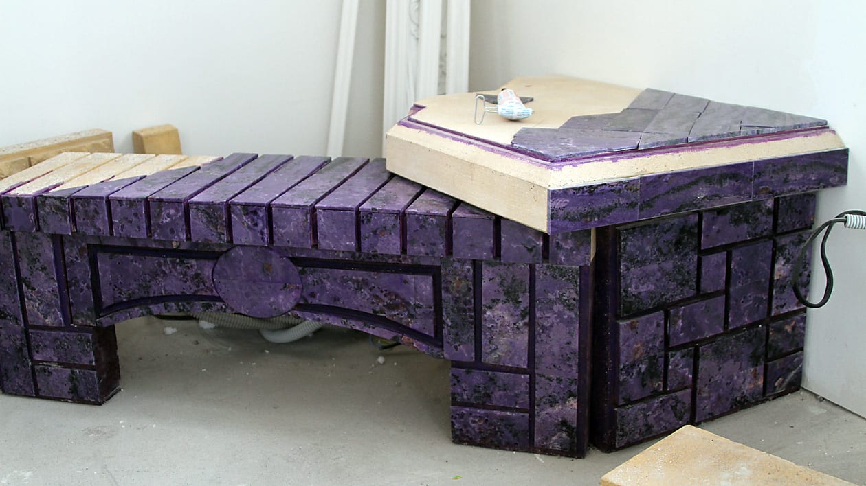 Чароитовая комната разместится на втором этаже здания. Её уже начали делать – на потолке сегодня видны сиреневые лепестки из чароита, внизу – выложенный сиреневой плиткой самых разных оттенков декоративный камин. Сначала мастера сделают углы комнаты, потом зай-мутся центральной частью, в последнюю очередь – полом. Чароитовой плиткой покроют консоль, журнальный столик. Мебель для комнаты специально заказывали в Италии, вся комната будет выполнена в стиле барокко. Тяжести, чрезмерности камня в этой комнате чувствоваться не будет, говорят авторы. Иначе вполне можно получить не произведение искусства, а «ванную комнату». Поэтому, к примеру, полы предложено сделать из паркета, а в середине мастера выполнят большой чароитовый цветок. «Мы хотим показать красоту камня и какие удивительные вещи можно из него сделать», – говорит Наталья Семихатова. На первом этаже музея будет представлена коллекция изделий из чароита, собранная Сергеем Семихатовым. Каждая фигурка и плиточка – это очень трудоёмкая работа.