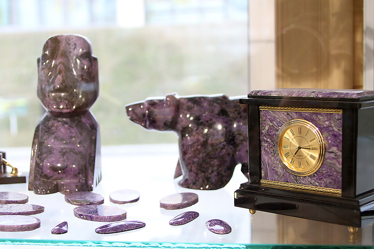 Работа была очень тяжёлой – летний сезон длился около 100 дней, рабочих забрасывали на место вертолётом. Камень добывали летом, а потом по замёрзшим рекам весной вывозили в Иркутск и Якутию на «КамАЗах» за 10–15 коротких дней. Однако в 70-е годы минерал стоил буквально копейки – 100 долларов за тонну обогащённого камня. Сиреневый камень был непопулярен, особого спроса на выточенные на токарных станках сиреневые вазы, шары, бусы не было. Просто минерал очень тяжёл в ручной обработке, и мастера не брались за изготовление фигурок. Он крошится, часто имеет неоднородную структуру. С нефритом, янтарём проще. В 1980-е супруги Сергей и Наталья Семихатовы открыли своё производство изделий из камня. У них получилось делать фигурки из чароита. Секретами обработки Семихатовы ни с кем не делятся. Сергея Семихатова не стало шесть лет назад. Сейчас «Байкалтрансгеологию» принял его сын Александр Семихатов, тоже геолог по образованию. Третий в поколении. В настоящее время цена на чароит сильно выросла в связи с тем, что были выработаны практически все проявления на месторождении.
