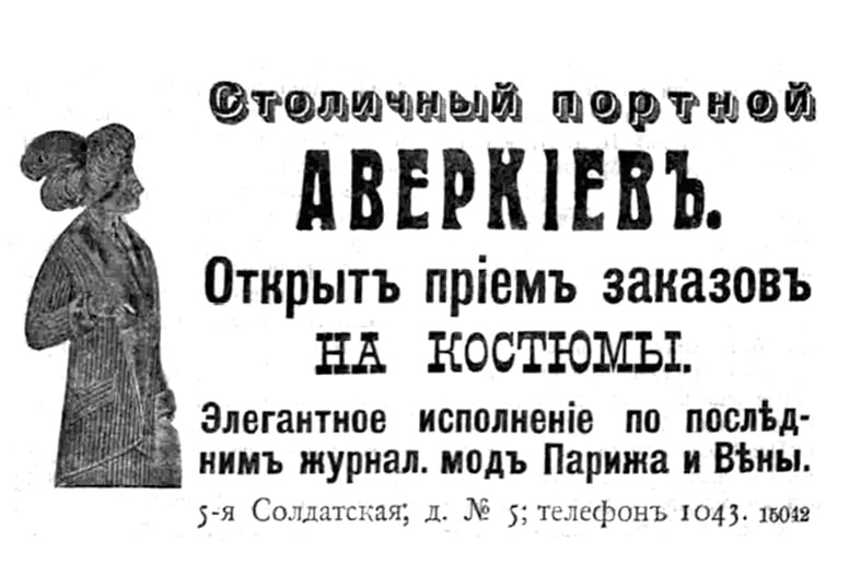 Заказы на военное и партикулярное платье принимались в магазине Шнейдера. Тут же имелся большой выбор фуражек всех форм и ведомств, шитые воротники всех классов. Портной Лейбович принимал заказы на дамское верхнее платье в доме на углу Амурской и Театрального переулка. Место само по себе было бойкое, однако и в этой мастерской перебивались главным образом чисткой одежды и выведением пятен.