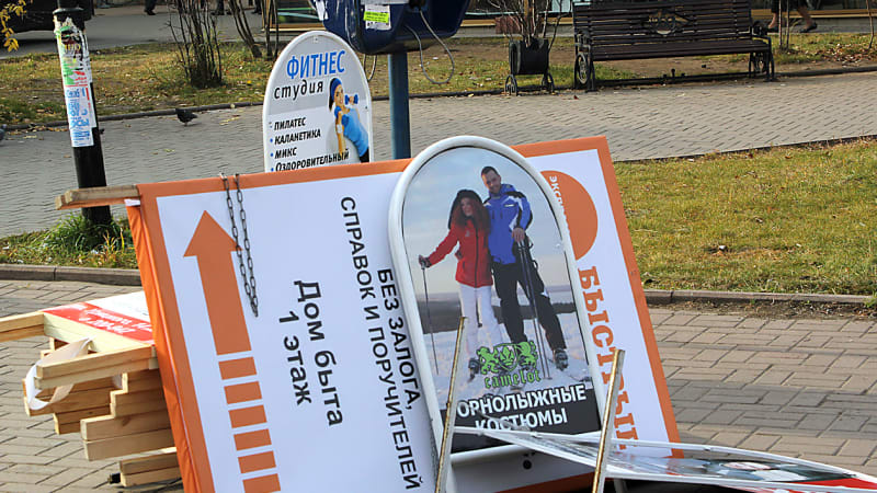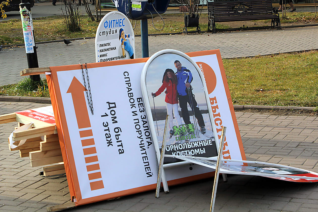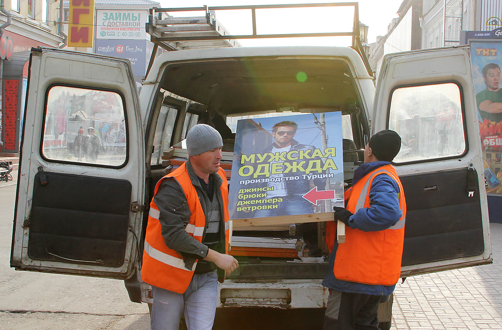 Прохладным солнечным утром работники подрядной организации «Горстрой» сделали свою работу быстро: собрали около 20 штендеров, лишь несколько из которых были прикреплены тросом к телефонной будке или фонарной опоре, и погрузили в служебную «Газель». Администрация размещала уведомление на собственном сайте и в газете «Иркутск», рассказала Наталья Бриль, адресно же об изъятии рекламных конструкций их хозяев не предупреждают, потому что предприниматели отказываются расписываться в получении уведомления.